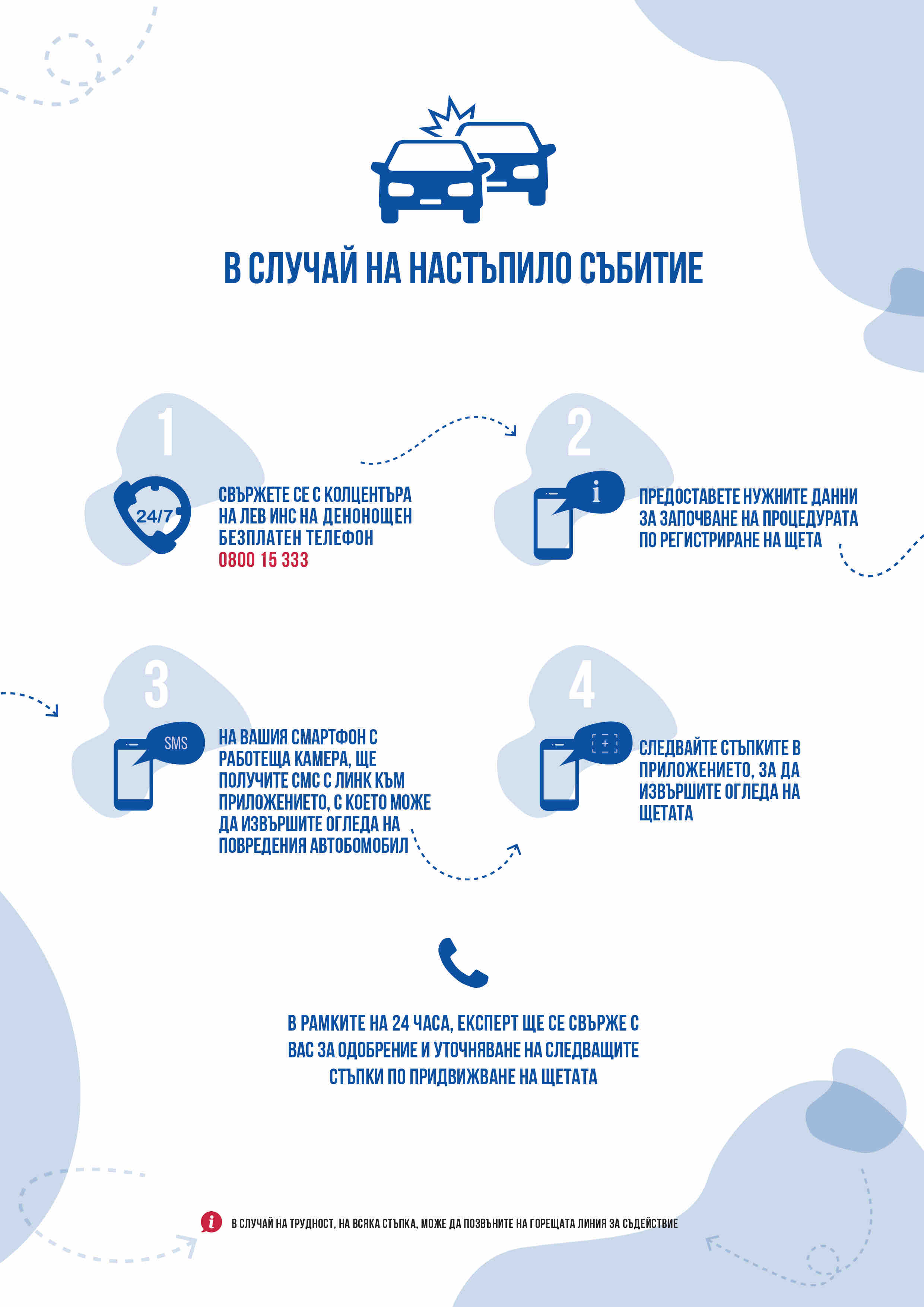 В рамките на 24 часа (в работни дни) от приключване на огледа, експерт на ЛЕВ ИНС ще се свърже с клиента за уточняване на следващите стъпки от процеса по обслужване на заявлението за щета.