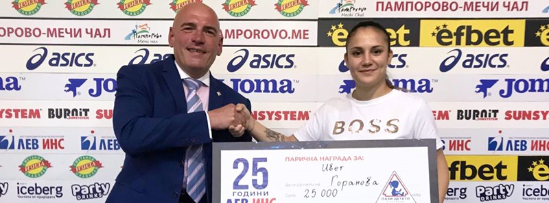 Генералният спонсор на Българска национална федерация карате Лев Инс награди Ивет Горанова за сребърния и медал на Европейското първенство по карате. Най-голямата застрахователна компания в България подкрепи Ивет със сумата от 25 000 лева с пожелание да продължава да покорява световните върхове и да прославя страната ни.