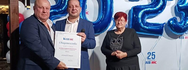 Ръководството на ЗК ,,Лев Инс“ АД награди представители на най – успешните агенции в страната в областта на селскостопанското застраховане. Г-жа Мария Масларова и г-н Павел Димитров отличиха с почетни сертификати Митко Пенев от агенция Силистра, Владислав Милев от софийски корпоративен център и Илко Искренов от агенция Кнежа. Благовест Панев от агенция София 5, Венета Коруева от агенция Хасково, Жечко Бонев от агенция Ямбол, Таня Стойчева от агенция Пазарджик 6 и Елка Алова от агенция Девин бяха наградени за много добрите постигнати резултати през 2022 г. Поздравяваме за високите постиженията и възпрепятстваните да получат сертификатите си лично - Анелия Христова от агенция Ловеч 1 и Станислав Колев от агенция Стара Загора. Поздравяваме всички колеги за проявения професионализъм и постигнатите резултати! Пожелаваме Ви спорна и успешна 2023 година!