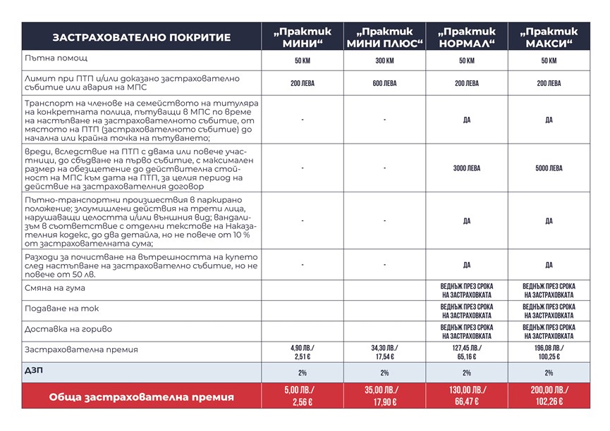 Пакетната полица "КАСКО Практик" е предназначена за застраховане на леки и товарни автомобили, и мотоциклети с български регистрационни номера.